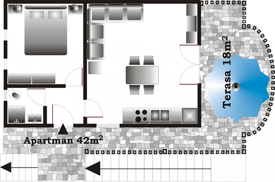 Apartman "PLAVI" ( 42m2) za 4 osobe sa ODVOJENOM spavacom sobom,i terasom od 18m2.