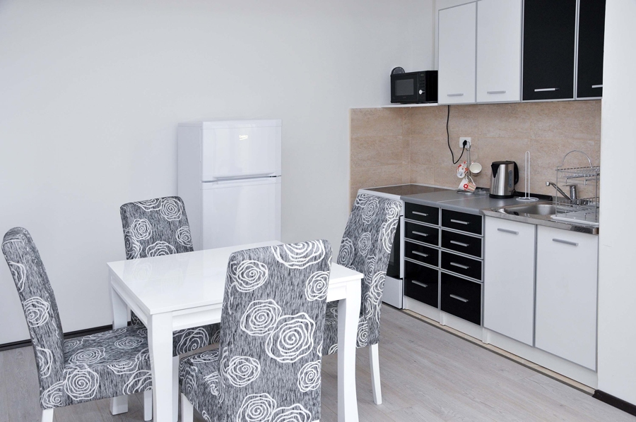 - Kuhinja je opremljena velikim friziderom, šporet- ravna ploča, rerna, mikrotalasna, čajnik, potrebno