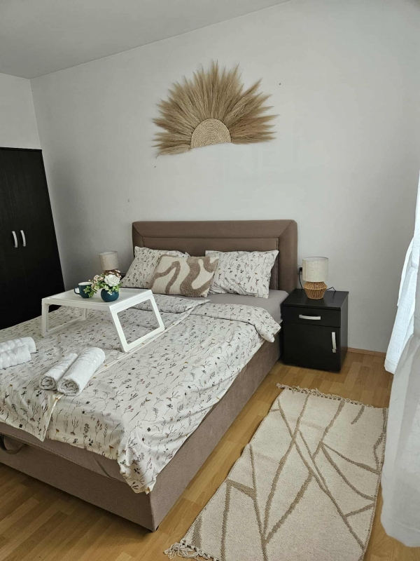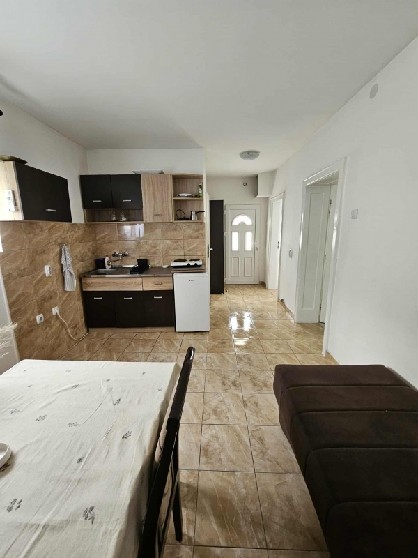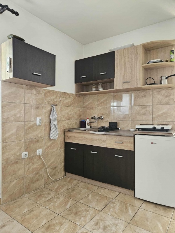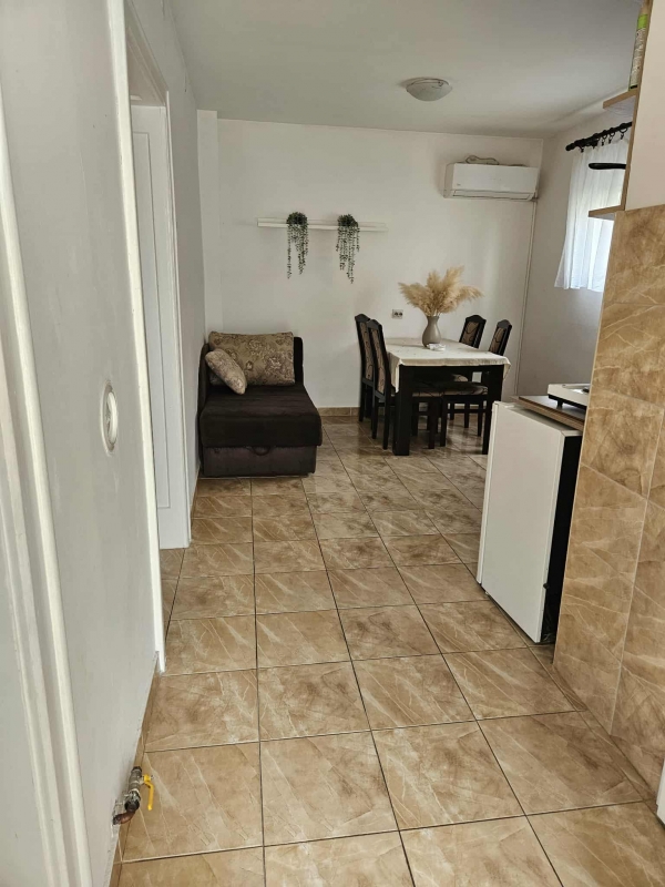 Kuhinja je opremljena sa svim postrebnim sudovima, friziderom, sporetom, klima uređajem. Jedna spavaca soba sa francuskim lezajem a druga sa dva singl lezaja.
