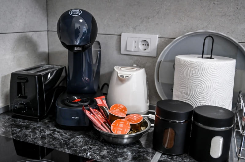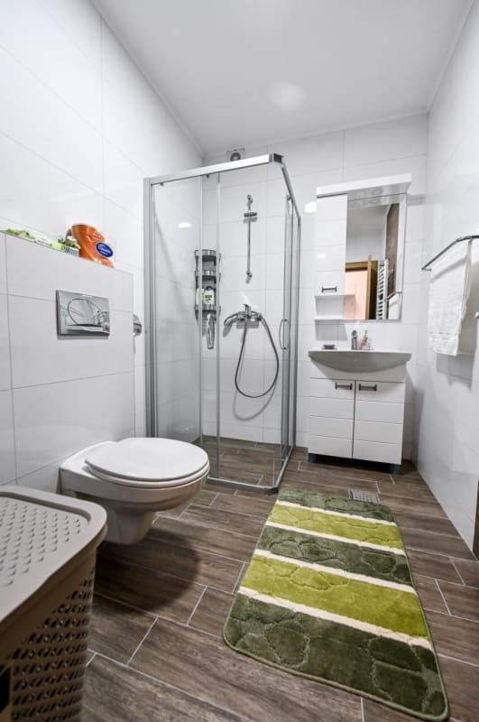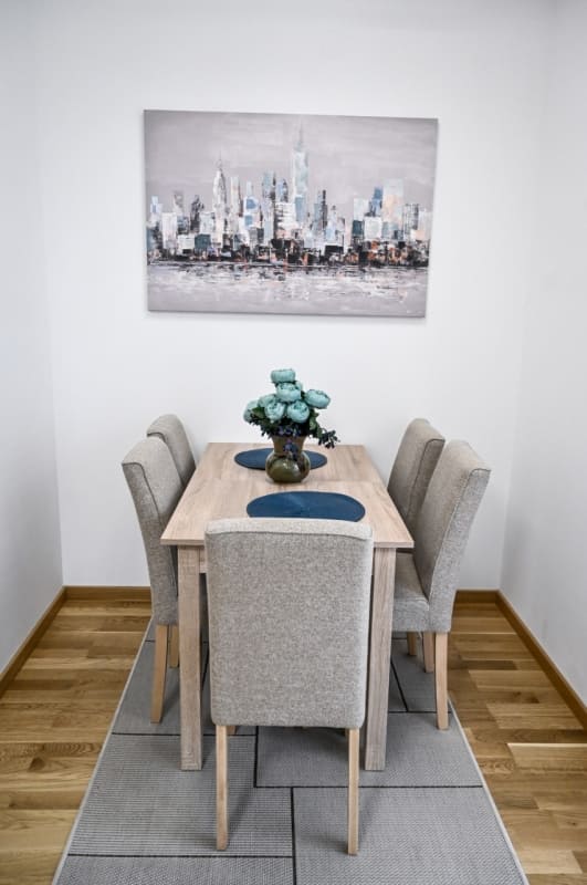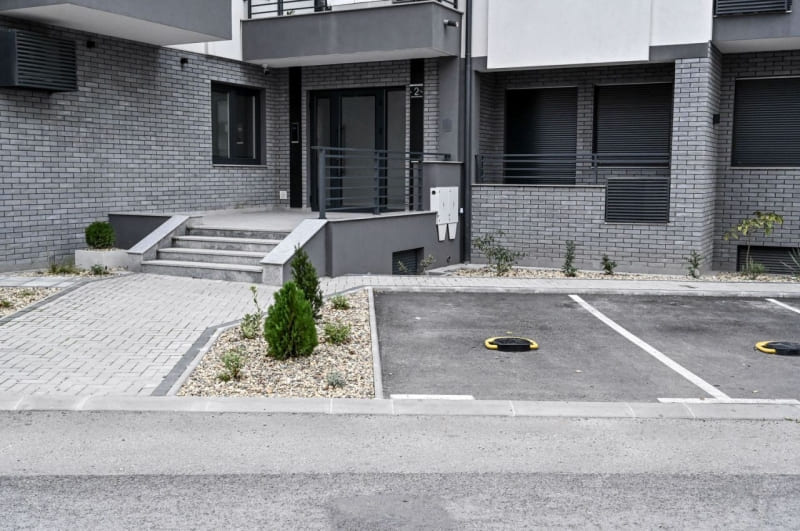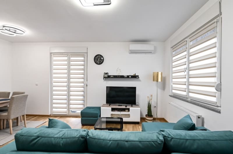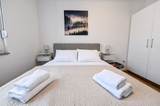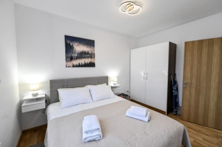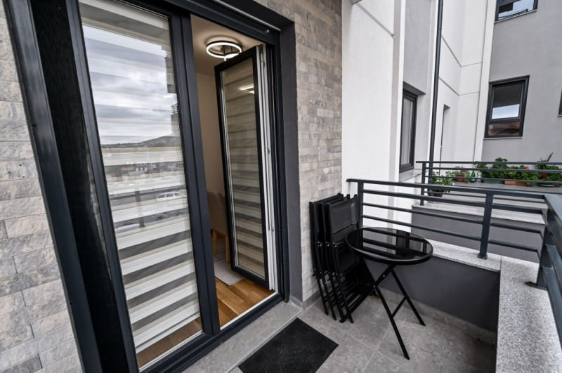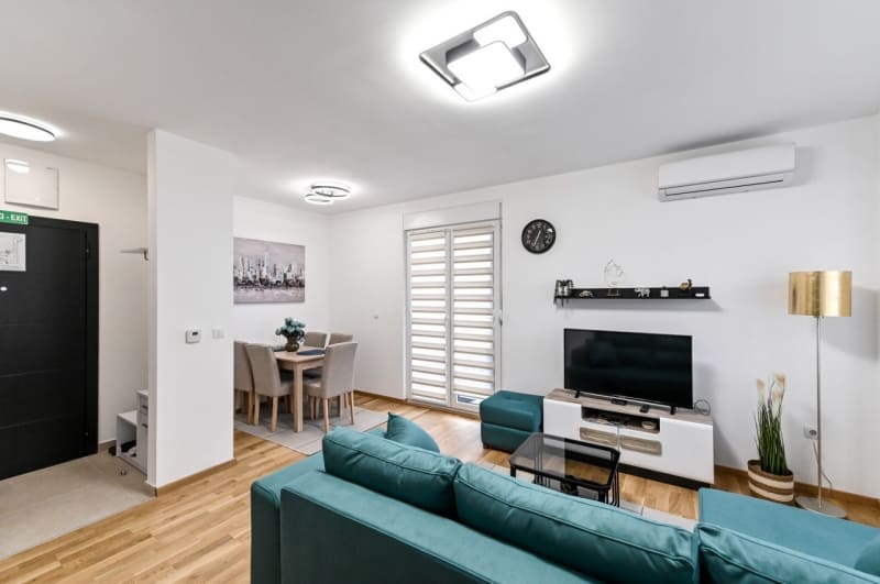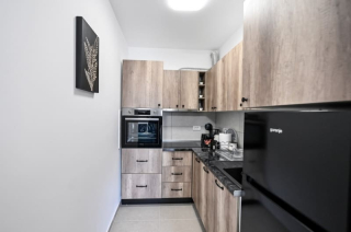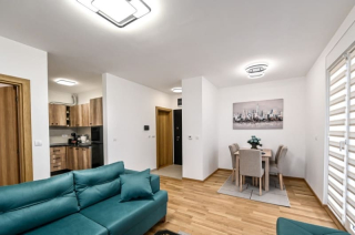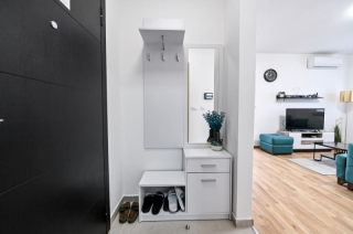 Poseduje kupatilo sa mašinom za pranje veša, klimu, hodnik, opremljenu kuhinju sa trpezarijom, spavaću sobu, dnevnu sobu sa terasom sa koje se vidi parking koji je u vlasnistvu apartmana.